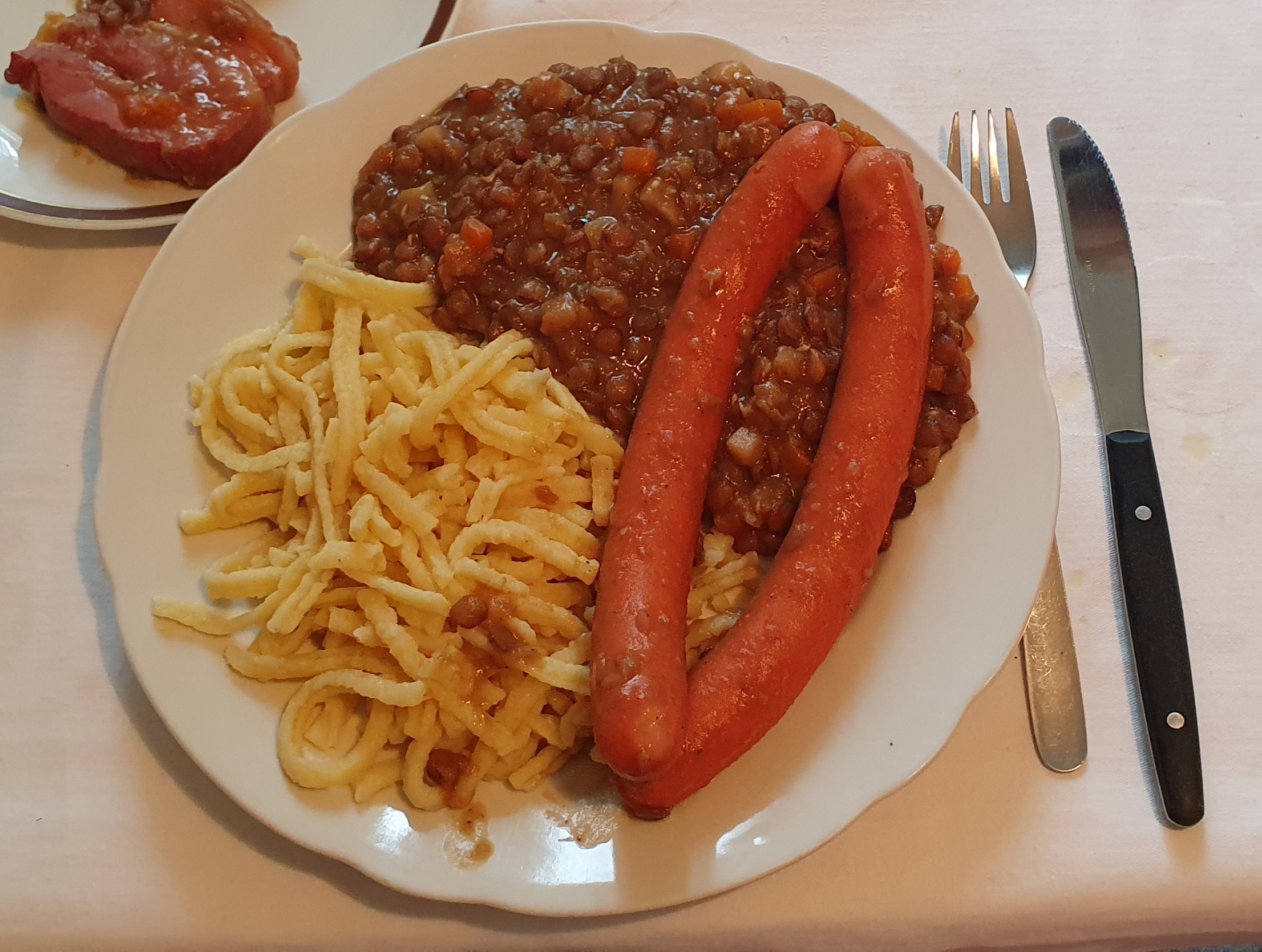 Dann 1 TL Senf und 1 glatten EL Essig in die Linsen geben. Abschmecken wer er saurer mag oder nicht.